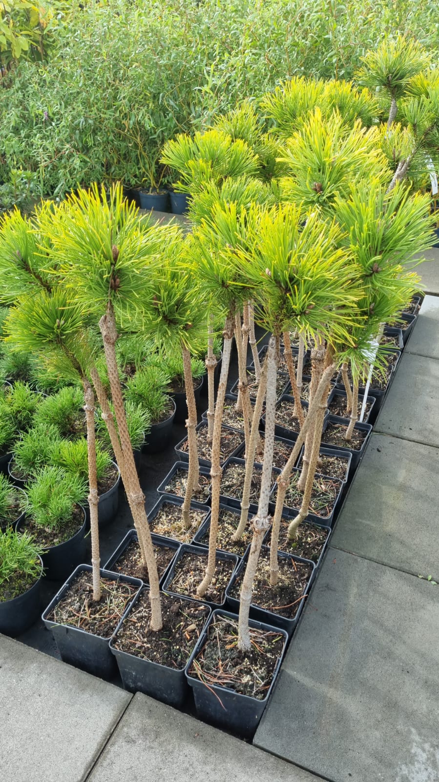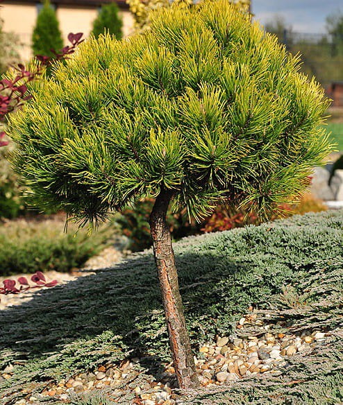 Habitus borovice kleče WINTER GOLD na kmínku je nízký, hustý a pravidelný, s mírně zploštělým kulovitým tvarem. Odrůda roste pomalu a dlouhodobě si zachovává kompaktní vzhled bez nutnosti tvarování. Roubování na kmínku umožňuje dobré vyniknutí koruny.