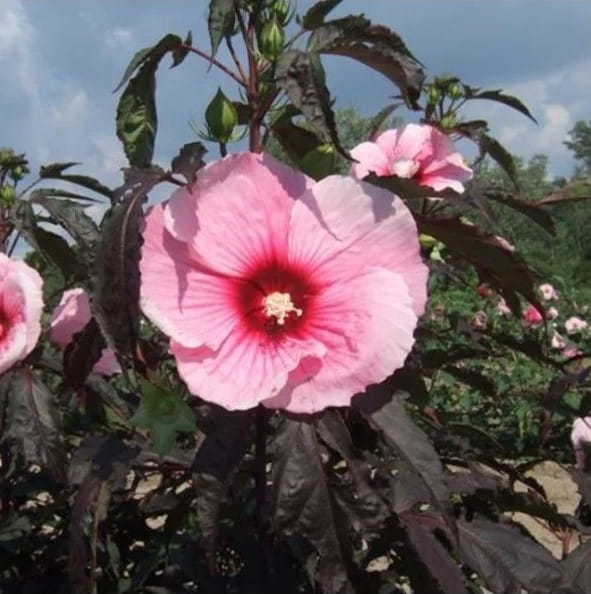 Hibiscus bahenní Summer Storm je výrazná trvalka s tmavě purpurovými, laločnatými listy a jemně růžovými květy. Dorůstá výšky 90–120 cm a vytváří kompaktní, husté trsy.