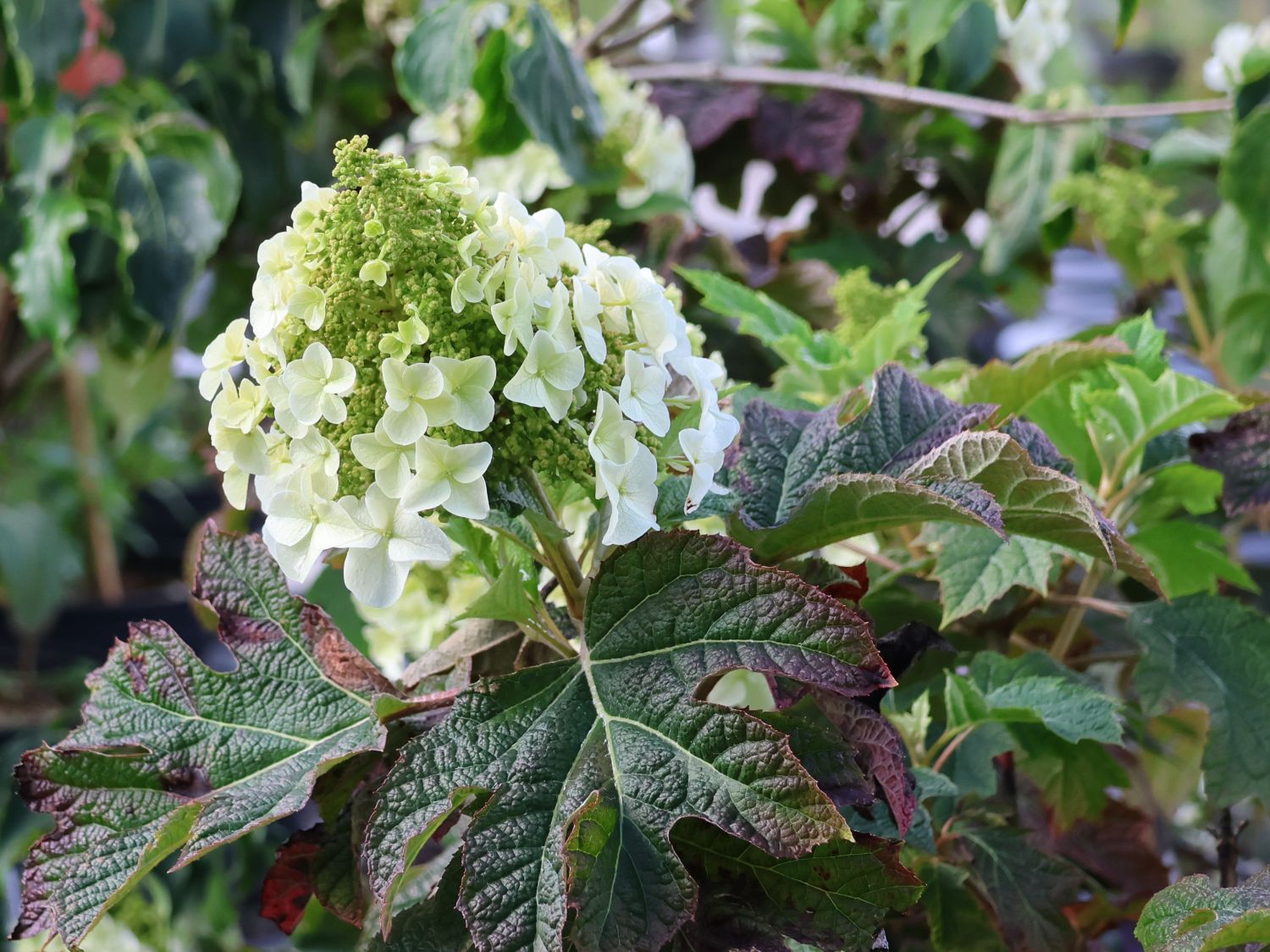 Hortenzie dubovitá ‘Jetstream’ je výjimečná odrůda, která vyniká svými velkými, hluboce laločnatými listy připomínajícími listy dubu a bohatými květenstvími. Tento keř dorůstá do výšky přibližně 1,2 až 1,5 metru a šířky podobného rozměru, přičemž vytváří hustý, zaoblený a dobře větvený porost. Hlavní předností ‘Jetstream’ jsou právě listy: tmavě zelené, výrazně klapované a celkově robustní, které dodávají rostlině elegantní vzhled po celou vegetační sezónu. Na podzim se listy přeměňují v ohnivé odstíny červené, fialové a oranžové, čímž přidávají další vizuální hodnotu zahradě.