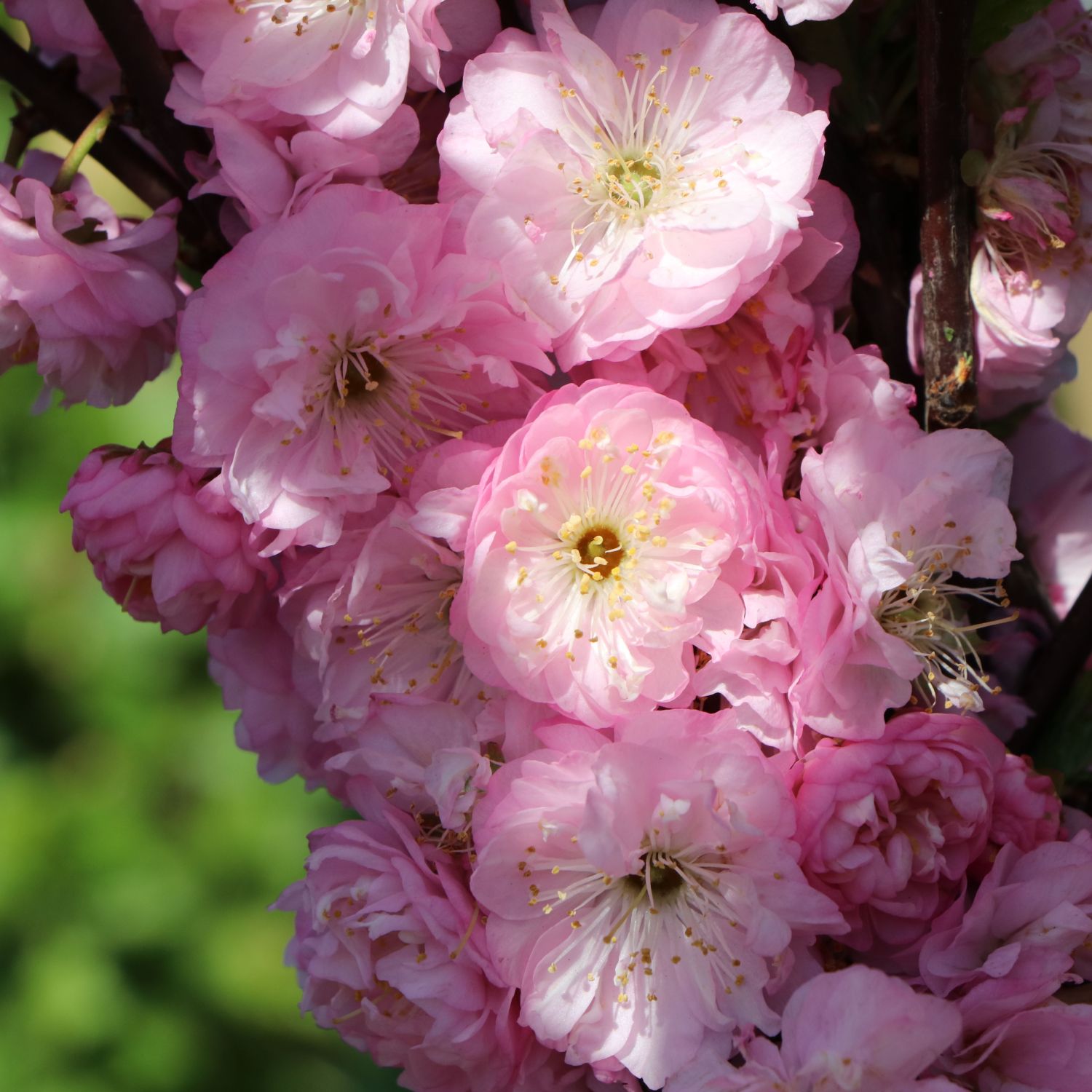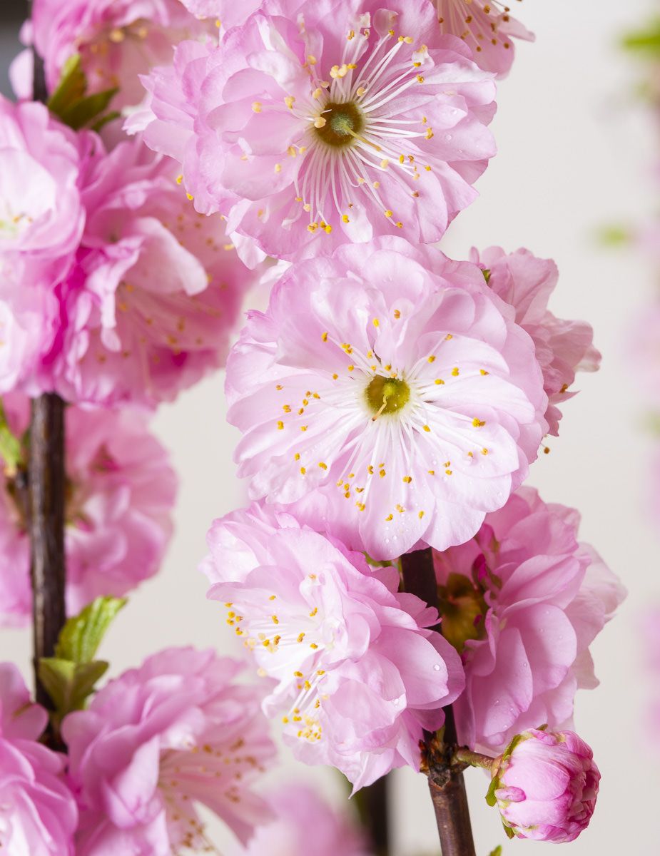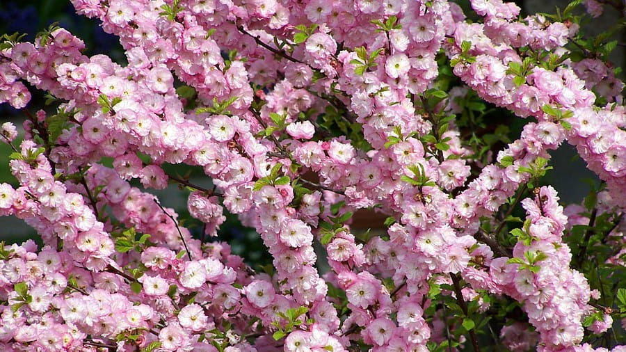 Květy jsou růžové, plné, připomínající malé růžičky o průměru kolem 3 cm. Hustě pokrývají výhony po celé délce.