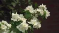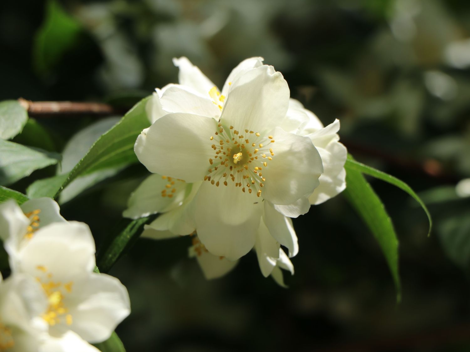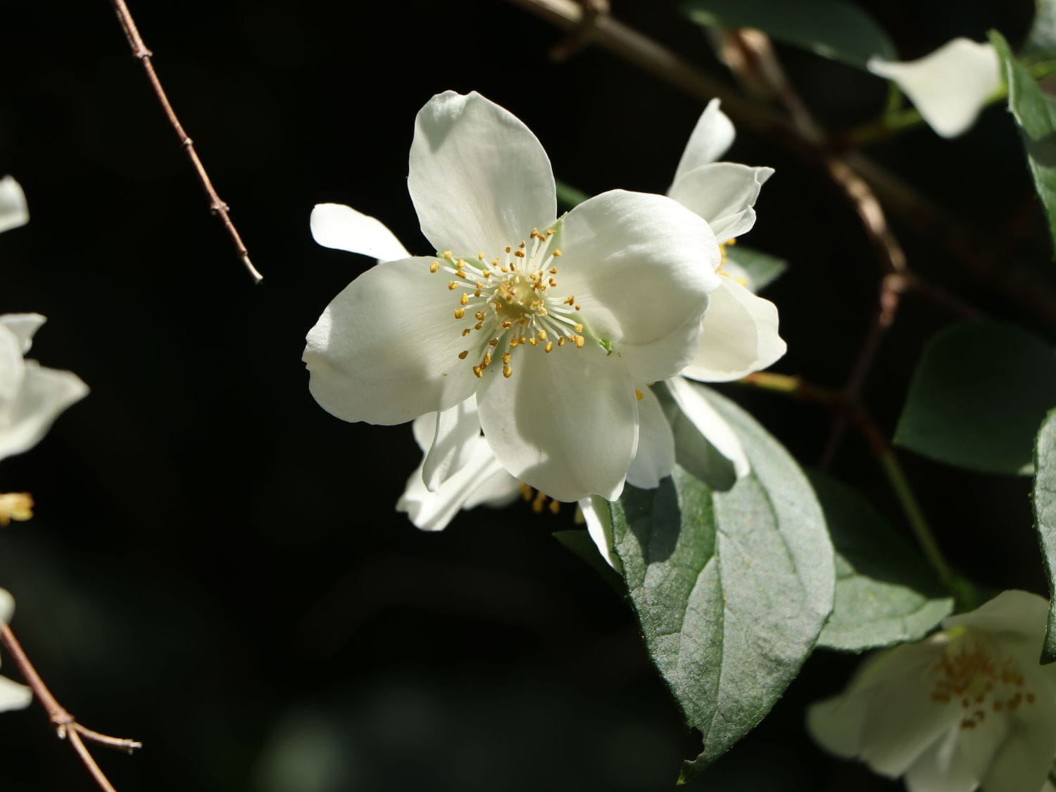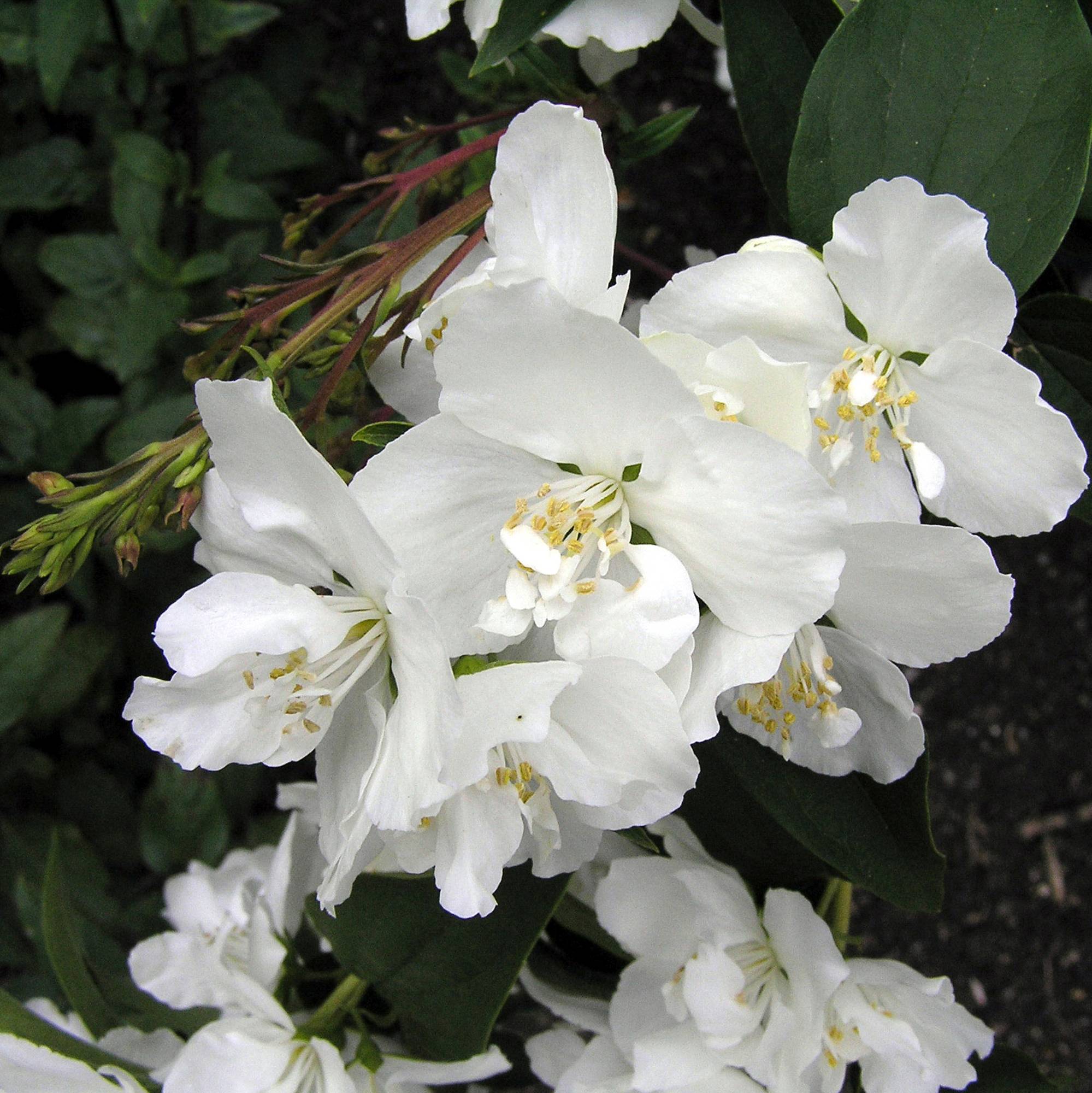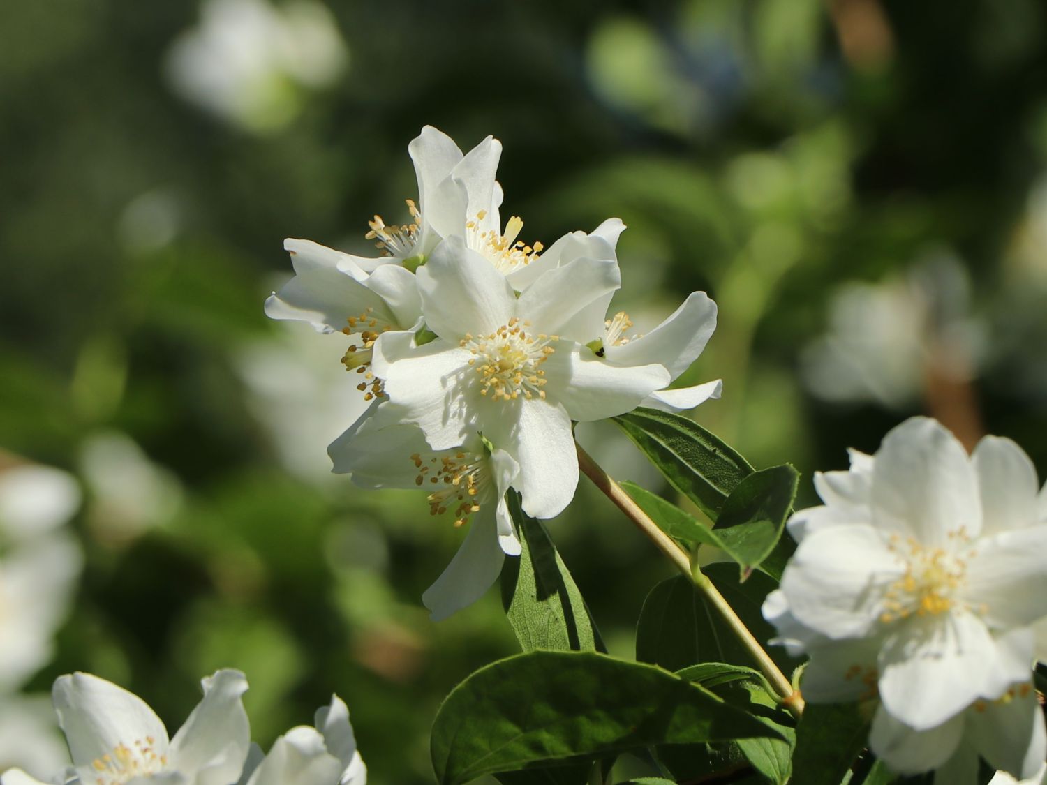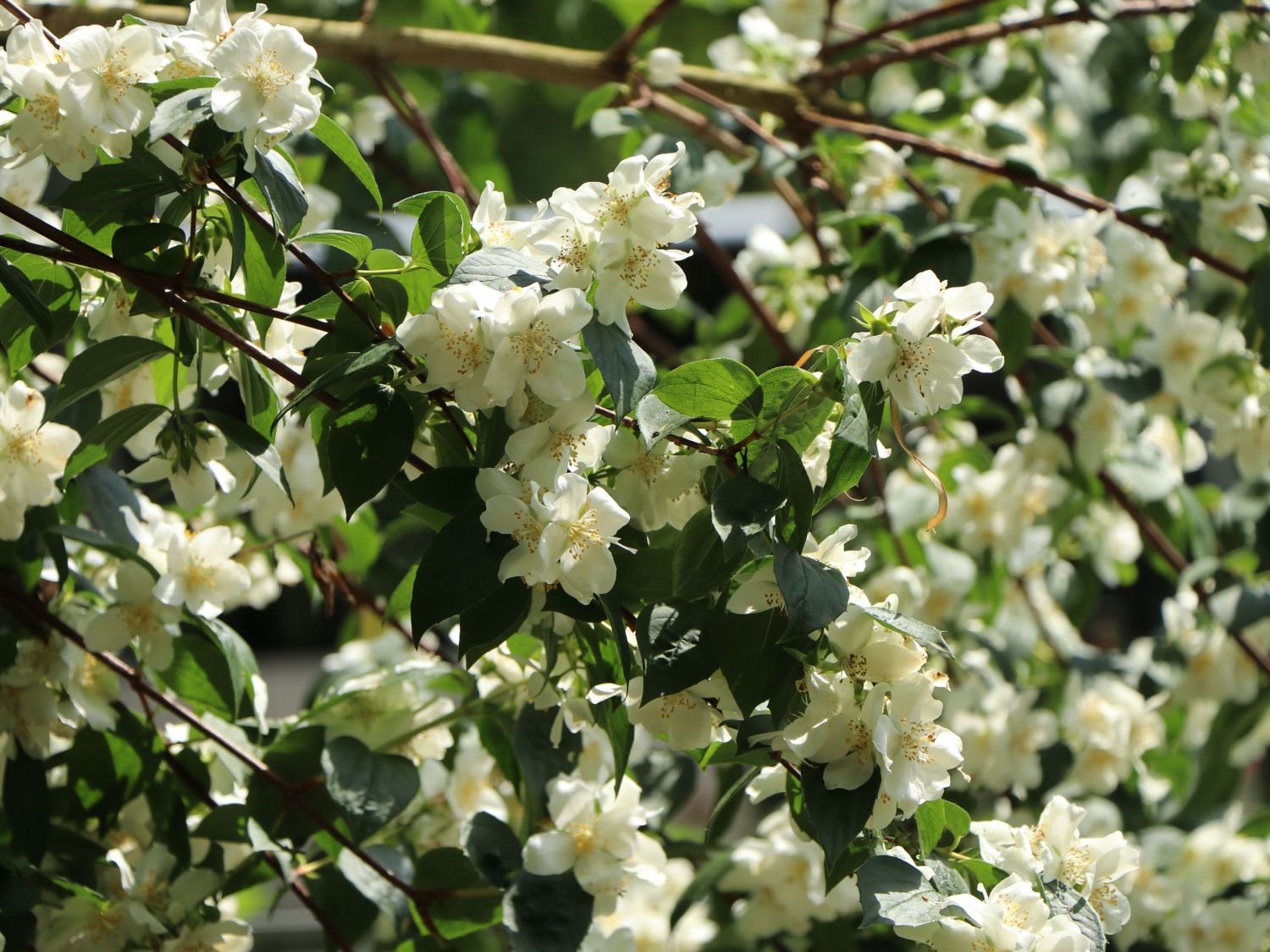 Kvete v červnu a červenci poloplnými, sněhově bílými květy o průměru kolem 4 cm, uspořádanými v hroznech po 3–5 kusech. Květy jsou velmi intenzivně vonné a přitahují opylující hmyz.