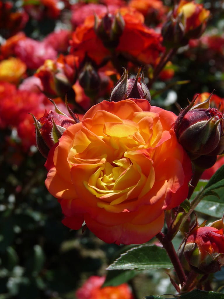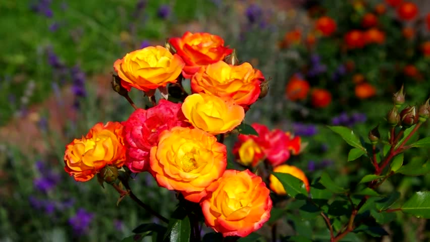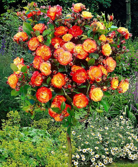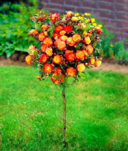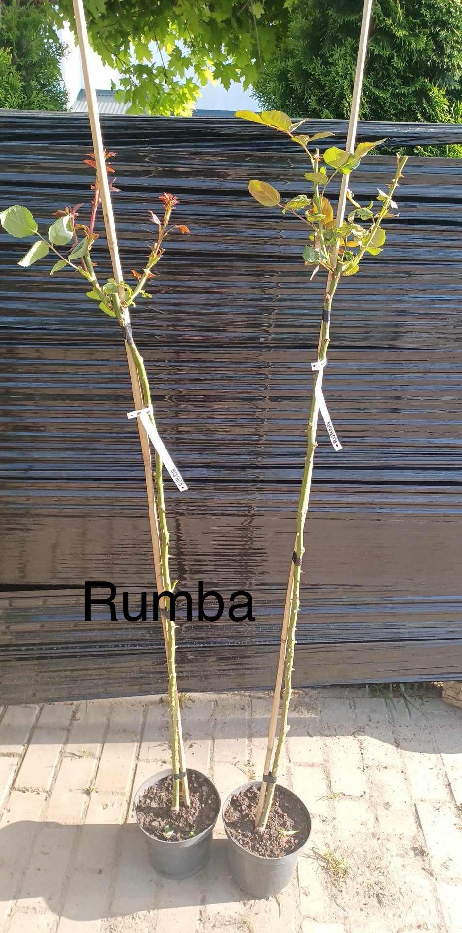 Růže RUMBA na kmínku je velmi dekorativní stromková růže s originálním dvoubarevným zbarvením květů. Kombinace žlutých, oranžových a červených tónů vytváří výrazný barevný efekt. Díky roubování na kmínku vytváří pravidelnou, dobře rozvětvenou korunu.