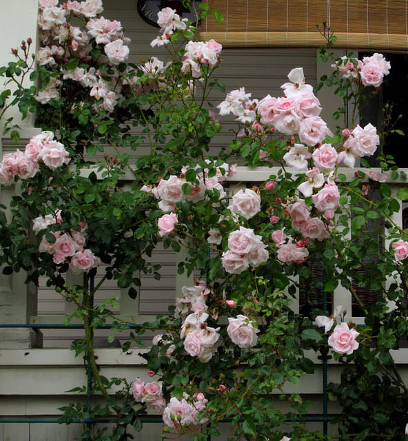 Popínavá růže Světle růžová je skvělá na pergoly, altány nebo ploty, kde vytváří krásné, kvetoucí stěny.