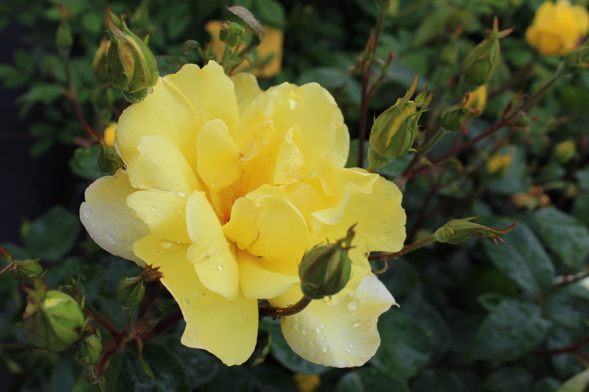 Řez popínavé žluté růže se provádí brzy na jaře. Odstraňují se slabé, poškozené nebo nemocné výhony, čímž se podpoří zdravý růst a bohaté kvetení.